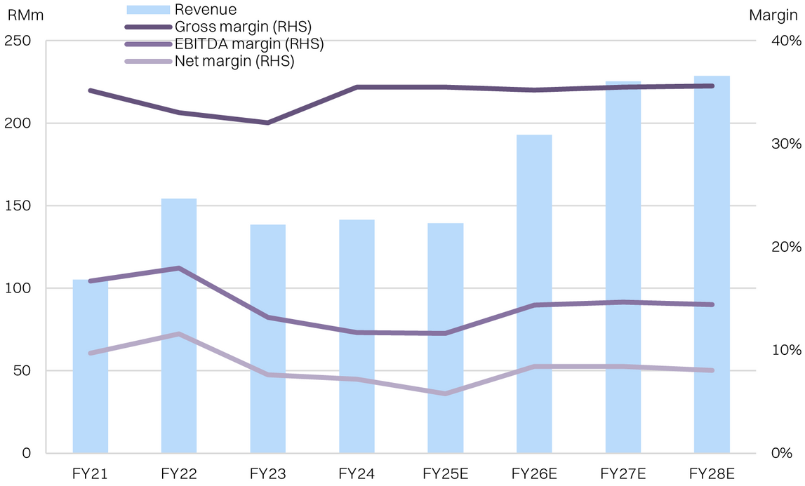 estimate that marginal sales above the current RM140m run rate should translate to a high-teens net margin (on incremental sales) compared with the current rate of ~6-7%. In turn, we forecast FY26E revenue growth of +31% YoY but a PATAMI growth of +89% YoY.