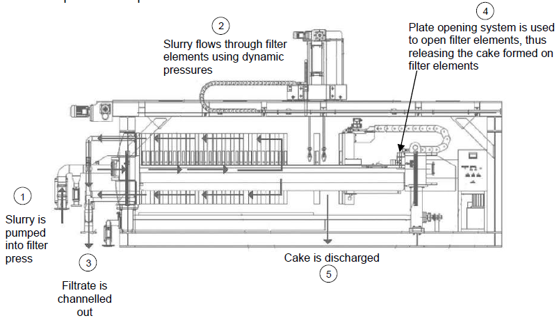 A filter press works by pumping slurry in and applying dynamic pressure. This allows an even distribution of slurry over the filter elements. This will allow the trapping and accumulation of solid particles (also known as cake) on the filter elements. The liquid portion or filtrate is channeled out of the press.