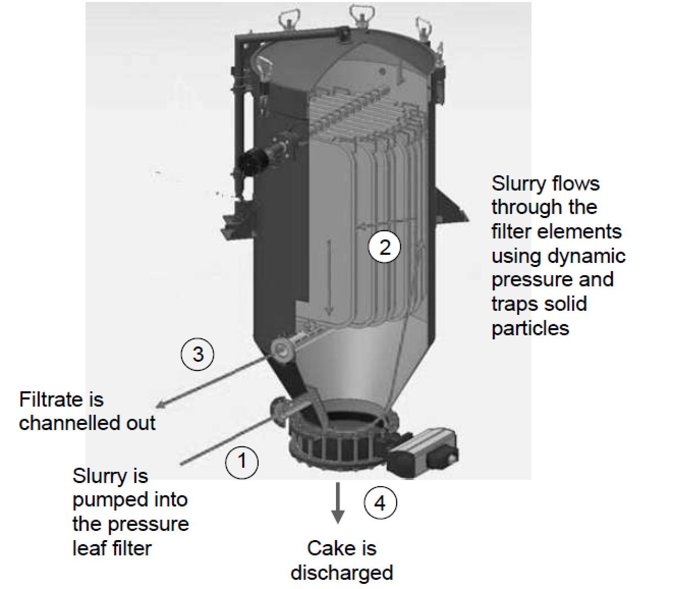 High pressure is applied via a pump - either liquid or compressed gas - within the pressure vessel to force the slurry to pass through the filter elements. Solid particles are then trapped on the surface of the filter elements, forming a cake while the liquid filtrate passes through.