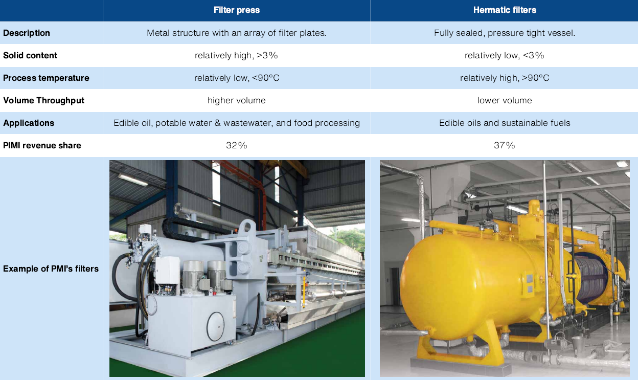 PMI supplies both filter presses and hermetic filters to the edible oils industry. However, it is the application of the two technologies is quite different. Filter presses that have the most immediate upside for PMI due to its potential application in waste management for water treatment.