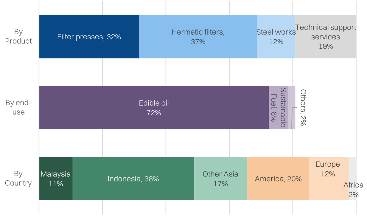 PMI specializes in manufacturing filter presses for liquid-solid separation. The primary application for the presses is in edible oils, and mainly for crude palm oil processing. The secondary application is within waste management, including water treatment as well as mining. This gives PMI potential as an ESG play. PMI is primarily an exporter, with over 85% sales coming from abroad, including countries like Indonesia, Europe, and US.